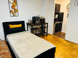 Apartament obejmuje jedną sypialnię oraz łazienkę wyposażoną w wannę i bezpłatne kosmetyki takie jak szampon, odżywka do włosów i mydło do ciała oraz suszarkę do włosów. Do dyspozycji gości są trzy miejsca do spania - sofa rozkładana oraz dwa inne łóżka - a podłogi wykończone są drewnem. W pokoju znajduje się ogrzewanie, żelazko, biurko do pracy oraz garderoba lub szafa, dla większego komfortu dostępne są poduszki pierzaste i syntetyczne.